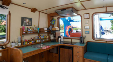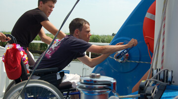 Die Gänge auf unserem Katamaran Beatrix sind extra breit und fast alle Segel sind vom Rollstuhl aus steuerbar. Dank eines modernen, hydraulischen Lenksystems können Segler mit einer reduzierten Arm- oder Handfunktion die Beatrix immer noch selbstständig steuern. Auf diese Weise kann jeder an der Navigation, dem Hissen der Segel, den Segelmanövern und der Steuerung des 18 Meter langen Katamarans teilnehmen. Die Beatrix ist mit allen modernen Annehmlichkeiten ausgestattet, so dass es auch möglich ist, jemanden an Bord zu pflegen und gemeinsam ein leckeres Essen zu genießen!